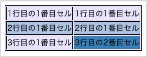| <html> <head> <title>ページのタイトル</title> <style> @import url(style.css) </style> </head> <body> <table class=”bg_table”> <tr> <td>1行目の1番目セル</td> <td>1行目の1番目セル</td> </tr> <tr class=”bg_tr”> <td>2行目の1番目セル</td> <td>2行目の1番目セル</td> </tr> <tr> <td>3行目の1番目セル</td> <td class=”bg_td”>3行目の2番目セル</td> </tr> </table> </body> </html> |