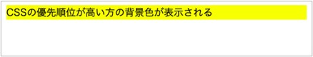 | <html> <head> <title>ページのタイトル</title> <style> @import url(style.css) </style> </head> <body> <div id=”sample_1″> <div class=”sample_2″> CSSの優先順位が高い方の背景色が表示される </div> </div> </body> </html> |