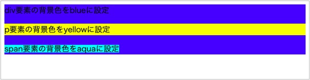 | <html> <head> <title>ページのタイトル</title> <style> @import url(style.css) </style> </head> <body> <div class=”c1″>div要素の背景色をblueに設定 <p class=”c2″>p要素の背景色をyellowに設定</p> <span class=”c3″>span要素の背景色をaquaに設定</span> </div> </body> </html> |