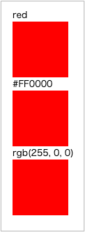 | <html> <head> <title>ページのタイトル</title> <style> @import url(style.css) </style> </head> <body> <span> red <div class=”c1″></div> </span> <span> #FF0000 <div class=”c2″></div> </span> <span> rgb(255, 0, 0) <div class=”c3″></div> </span> </body> </html> |