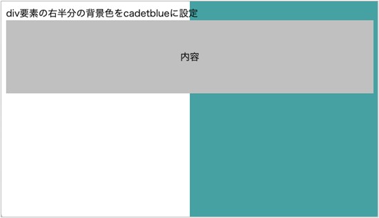 | <html> <head> <title>ページのタイトル</title> <style> @import url(style.css) </style> </head> <body> <div class=”c1″>div要素の右半分の背景色をcadetblueに設定 <div class=”content”>内容</div> </div> </body> </html> |