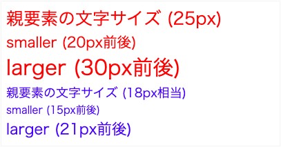 親要素の文字サイズがキーワードで指定されている場合、1段階増減したキーワードと同等サイズ、数値+単位での指定の場合、largerは親要素の120%〜150%に拡大され、smallerは親要素の80%〜90%に縮小されます。