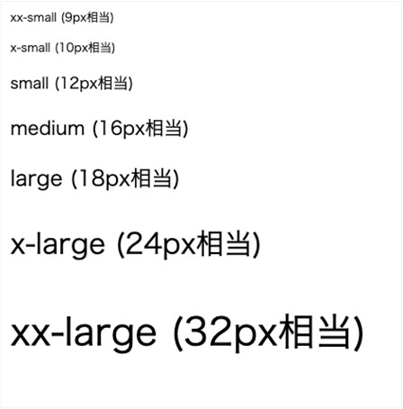 絶対値(xx-small、x-small、small、medium、large、x-large、xx-large)での文字サイズ指定例