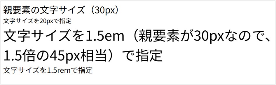 emは親要素の文字サイズの倍率(1em=等倍)で指定するため、同じ数値を指定しても、親要素の文字サイズによって表示される結果が変わります。