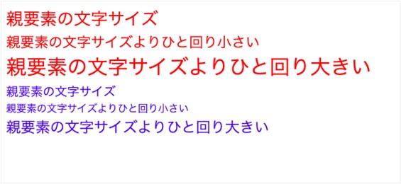 largerやsmallerは相対的なサイズのキーワードで、親要素の文字サイズを基準に1段階大きい、または小さいサイズで表示します。