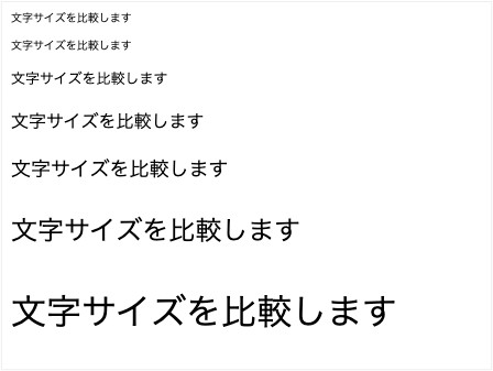 <html> <head> <title>ページのタイトル</title> <link rel=”stylesheet” href=”style.css” type=””text/css> </head> <body> <p class=”size_ex1″>文字サイズを比較します</p> <p class=”size_ex2″>文字サイズを比較します</p> <p class=”size_ex3″>文字サイズを比較します</p> <p class=”size_ex4″>文字サイズを比較します</p> <p class=”size_ex5″>文字サイズを比較します</p> <p class=”size_ex6″>文字サイズを比較します</p> <p class=”size_ex7″>文字サイズを比較します</p> </body> </html> |